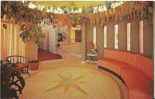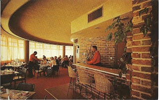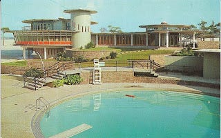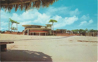 While the backs of the postcards aren't posted here, some of the descriptions are choice. About the shot from the beach (center right) and about the pool shot (center left): "Glamorous Isle Dauphine Beach Club on Gulf Beach. A Private Club for Members and Guests. " "Glamorous" appears to have been defined differently in 1958, and certainly doesn't resemble the "Glamorous" of Fergie fame. About the lobby (bottom left): "Exotic lobby of Isle Dauphine Club". I really wonder what's hanging from the ceiling. About the bar: "Dining Room with a Thrilling view of Blue Gulf of Mexico." These shots capture the period so well: the wicker bar stools, the circular building - these must have been quite chichi in their day.