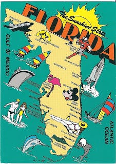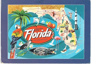 The postcard on on the right, of Key West, included a message on the back that said: "If you ever come to Florida, skip everything else and come sraight to Key West." I imagine it to be a bit like San Francisco in the tropics, but smaller: lots of eccentric, colorful, and interesting people drinking a bit too much booze, but sporting killer tans, and wearing Hawaiian shirts and flip flops. It may not be reality, but that's how I picture it.