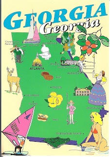 I love the postcards that feature a state map. On this map, you see the things you would expect on a map from Georgia: golfers, wind surfers, and a hunter. HUH? Well at least the peach blossoms, pecans, a southern belle, and a mansion that looks like Tara are what you'd expect. I also see the the Okefenokee Swamp is at least partially in Georgia, straddling the border with Florida. It is one of the largest swamps in the world.