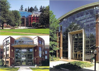The postcard on the left shows the Lillis Business Complex. If I remember correctly, it is a completely green building. On the right is Hayward Field, one of, if the not the best, track stadiums in the country. Clinton's dorm is right across the street from this stadium (the one you can see from the overhead shot of the stadium).