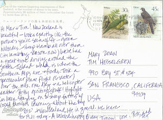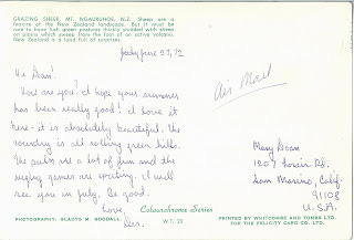 This must be one of the reasons there are so many bad sheep jokes about New Zealand. Three postcards, sent over a twenty year period, all featuring sheep. Close ups of cute little lambs, a view of a flock, and sheep as interest in the foreground of a shot of a distant mountain - a variety of ways to show pictures of sheep.